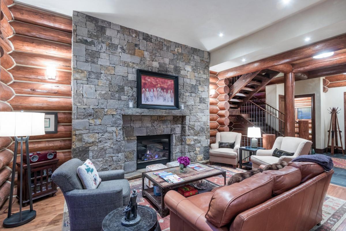 Heading up the wood stairs with iron accents guest marvel at the exposed logs and high ceilings which are found throughout the home. The first room off the staircase to the left is the bunk room with flat screen TV and custom-made snowboard shelving, while across the hall are the two master suites. The first is furnished with a king bed, flat screen TV, walk-in closet and views from the large picture windows that take up almost the entire north wall of the room. An en suite bathroom with white stone tiling and countertops, large glass shower with waterfall shower head and Venetian plaster walls finish out this beautiful space. Next door is the second Master Suite with hardwood floor, vaulted ceilings, exposed wood beam walls, large north facing window, flat screen TV, walk in closet and generous master en suite bathroom. White stone and beautiful exposed wood create a tranquil space when combined with the large freestanding soaking tub, glass shower with waterfall shower head and dual vanity sinks.