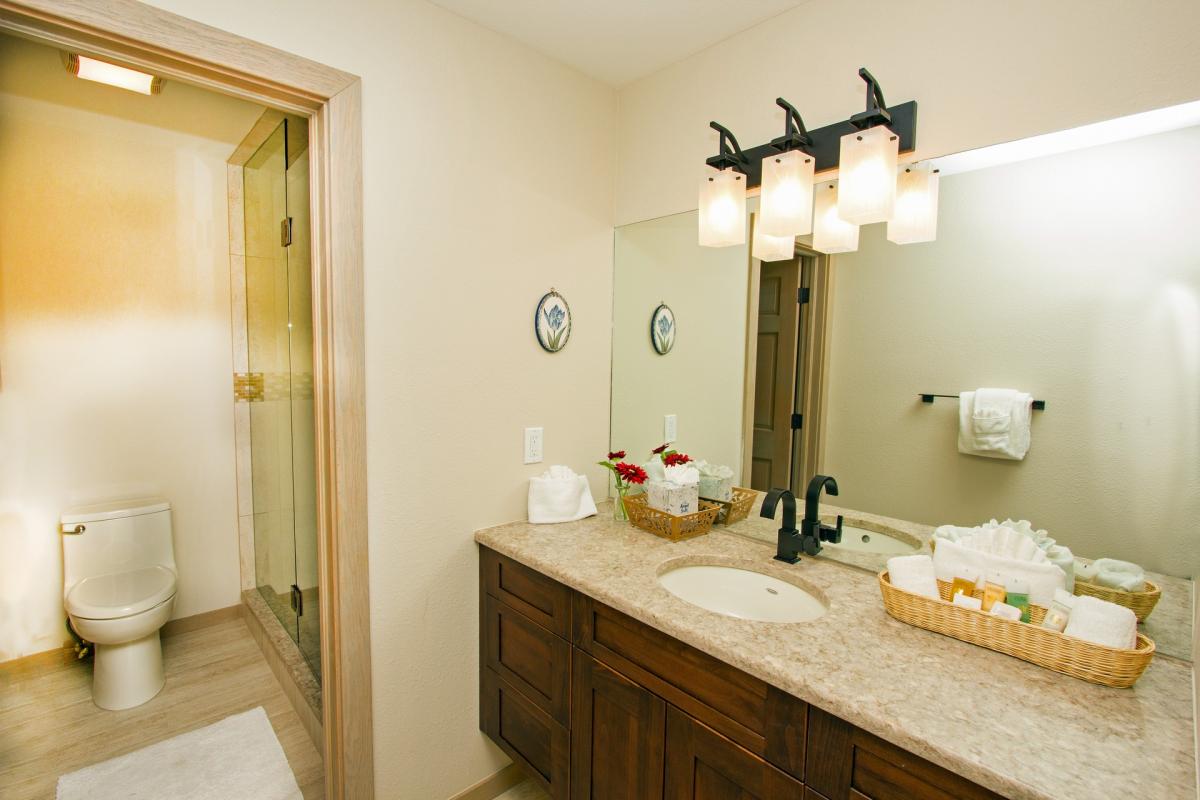 The additional two guest rooms are located on the lower level of this home. Both bedrooms include a flat screen television. One guest room offers dual queen beds with an en suite bathroom with shower/tub combo. The last guest room offers a relaxing sleep on a king size bed with an en suite bathroom featuring glass shower with dual waterfall shower heads.